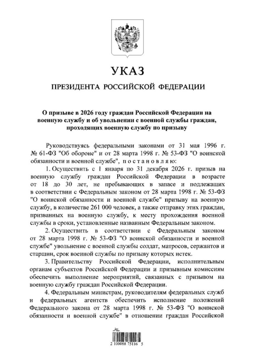 «Осуществить с 1 января по 31 декабря 2026 г. призыв на военную службу граждан Российской Федерации в возрасте от 18 до 30 лет, не пребывающих в запасе и подлежащих <…> призыву на военную службу, в количестве 261 000 человек, а также отправку этих граждан, призванных на военную службу, к месту прохождения военной службы»