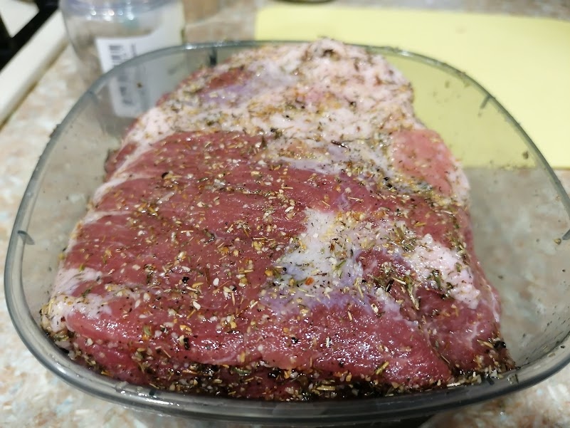 Так уж получилось, что сегодня мы долго ездили по магазинам, поэтому что-то подготавливать я начала только вечером (+4 часа с Москвой). Засолила кусок свиной шеи сухим посолом, планирую сделать домашнюю буженину (на фото выше). Намазала растительным маслом мясо, чтобы соль и специи лучше прилипли, и убрала в герметичный контейнер, который поставила в холодильник.