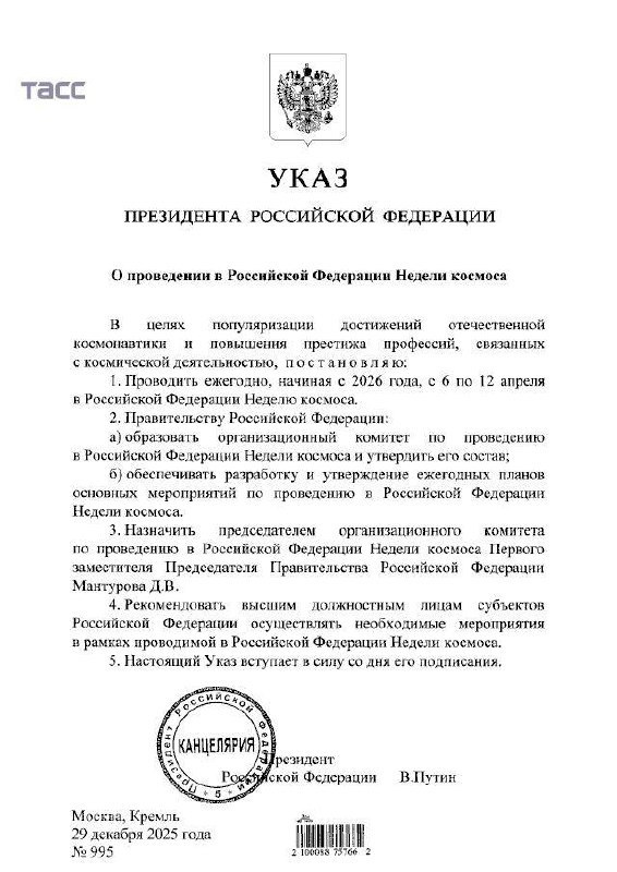 Президент России Владимир Путин утвердил проведение Недели космоса ежегодно с 6 по 12 апреля