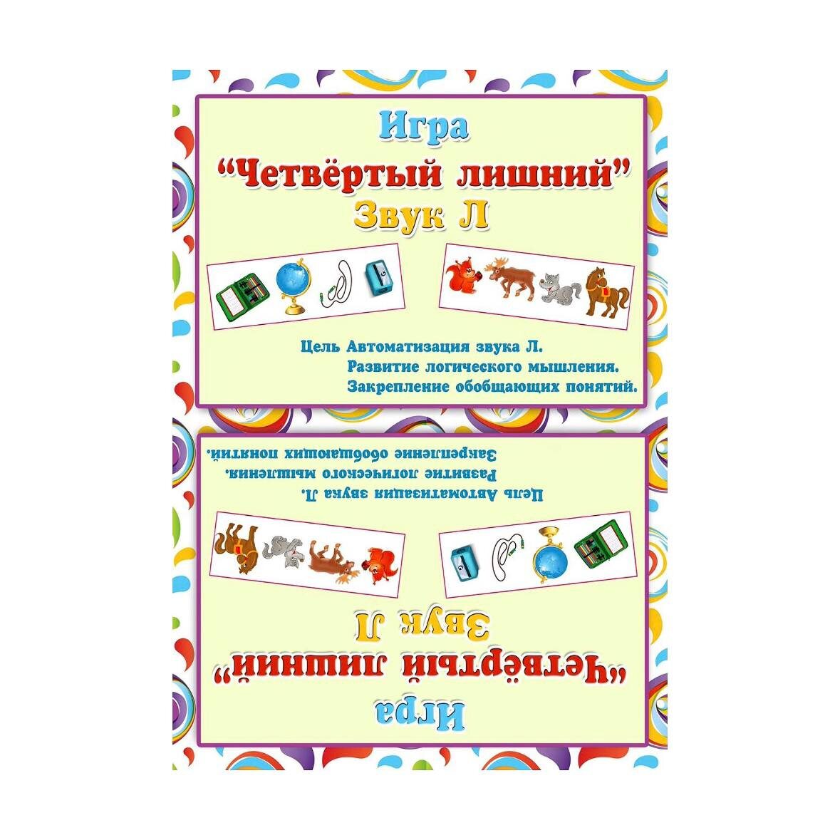В основе пособия — игра «Четвёртый лишний. Звук Л». Это задание позволяет одновременно работать над