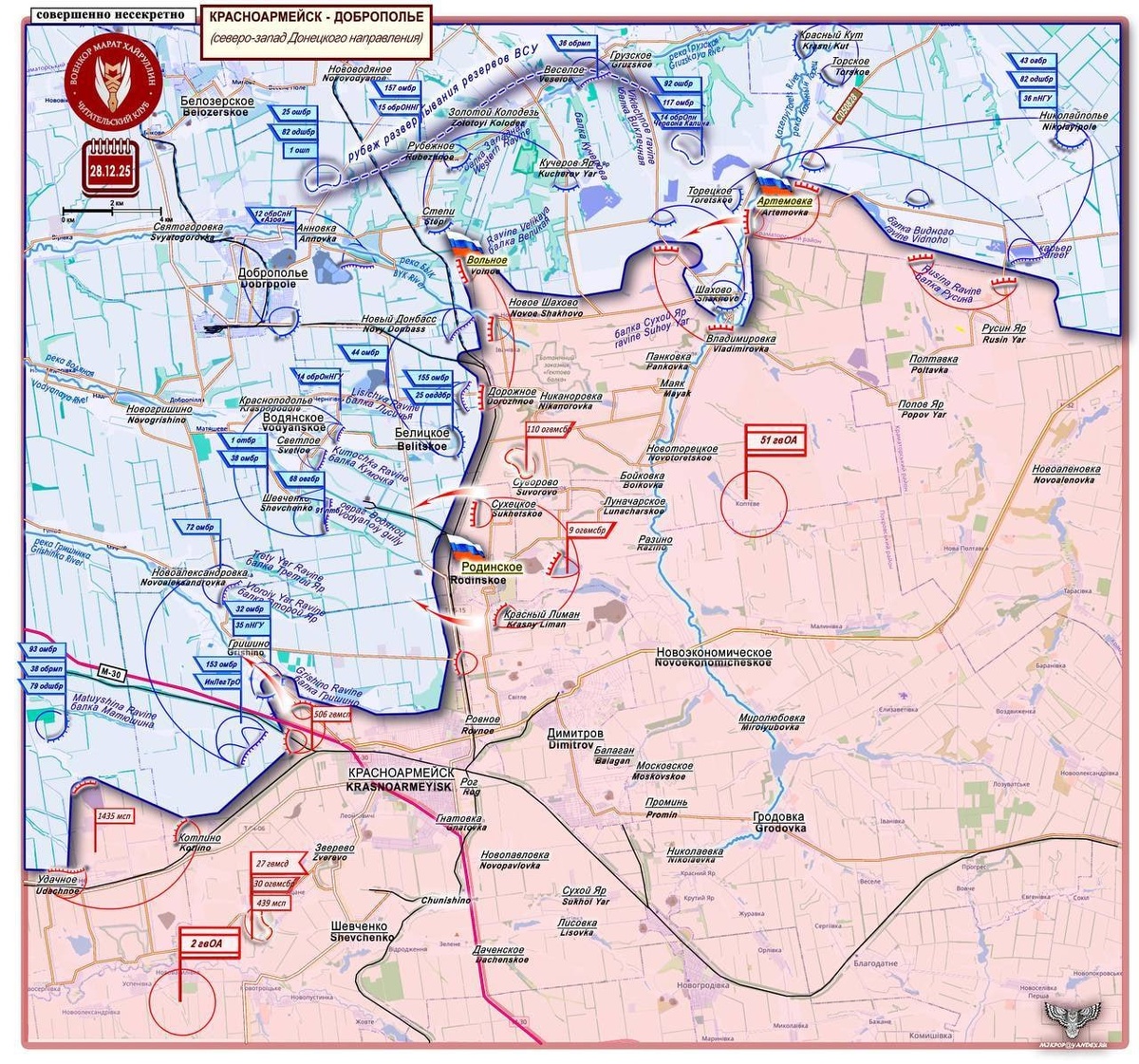 Карта боевых действий на участке Котлино - Красноармейск - Родинское - Шахово - Русин Яр на 28.12.2025.