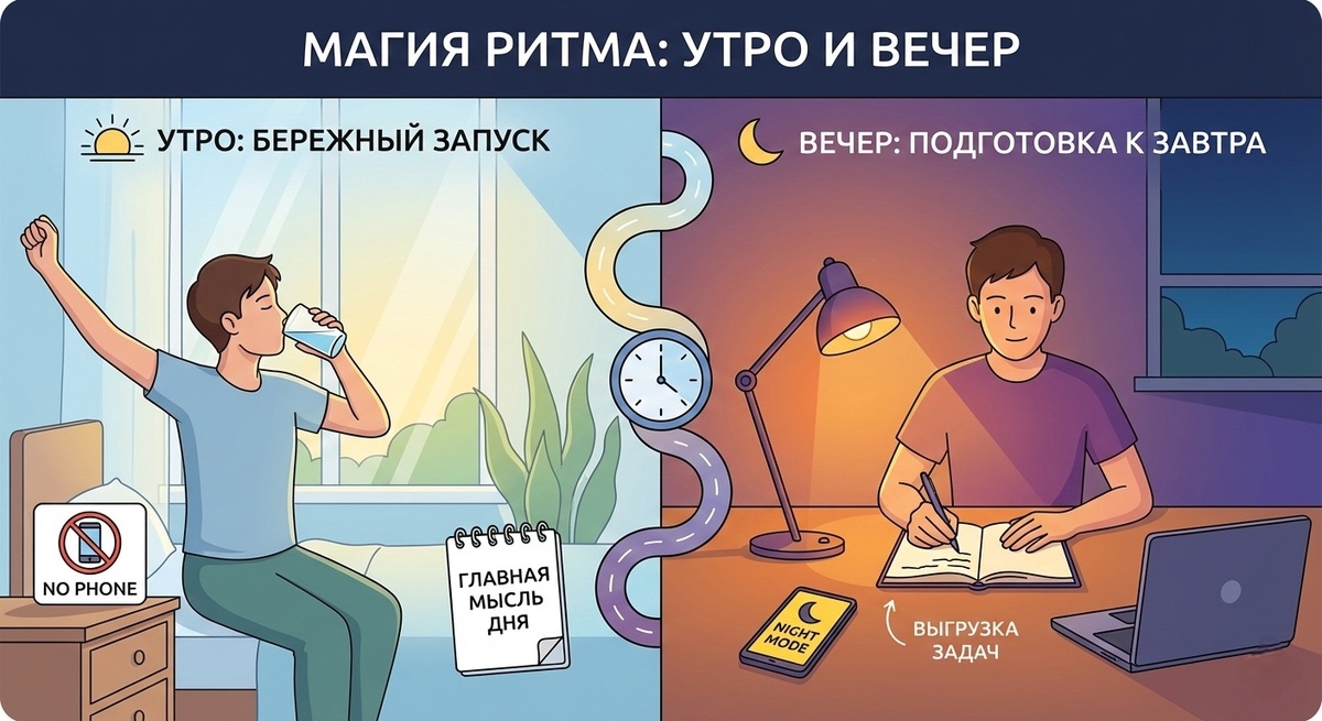 Дисциплина в начале и в конце дня создает «защитные барьеры». Днем может происходить любой хаос, но вы знаете, что у вас есть два островка спокойствия. Это дает чувство контроля над своей жизнью, которое важнее любого тайм-менеджмента.
