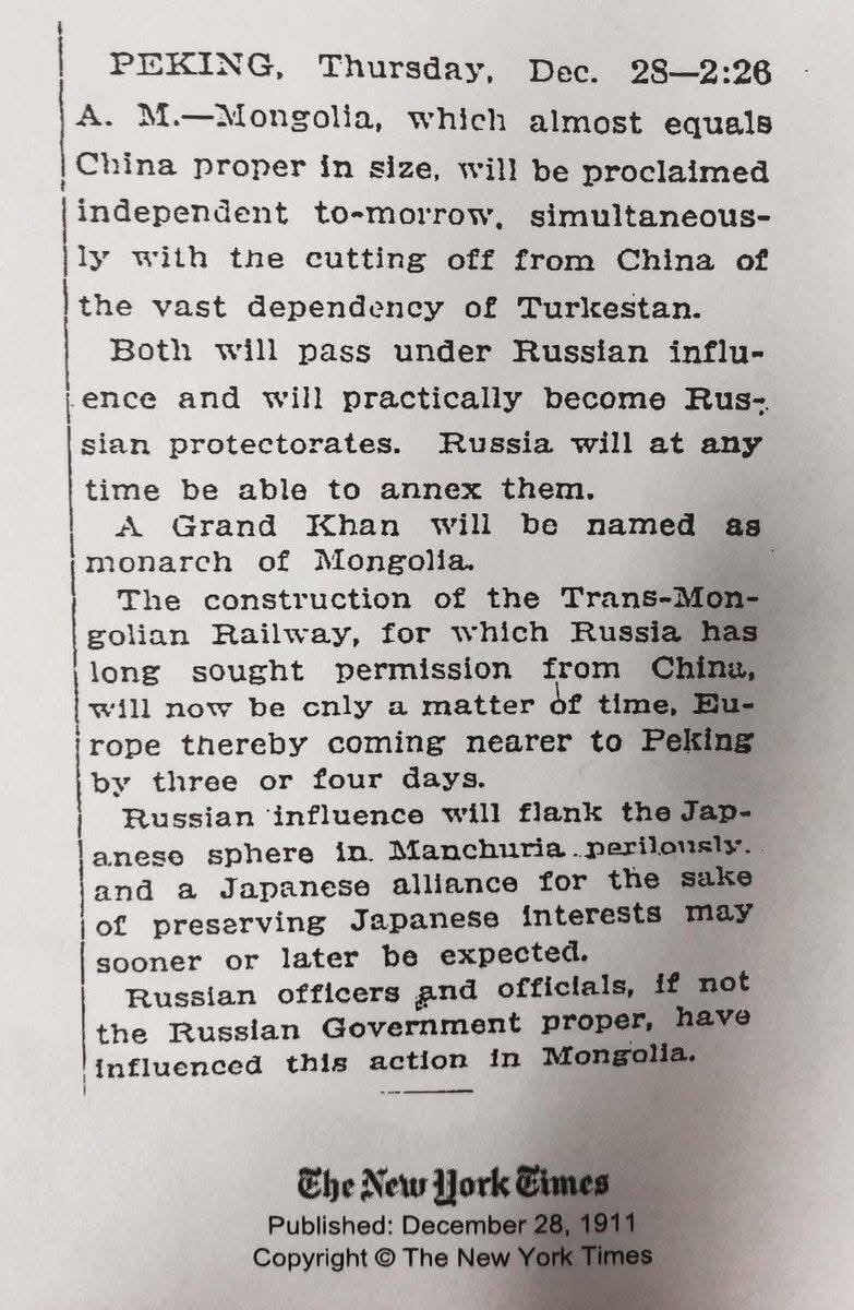 Газета "Нью-Йорк Таймс", уже предвидя провозглашение независимости Монголии 29 декабря 1911 года, за день до этого публикует сообщение из