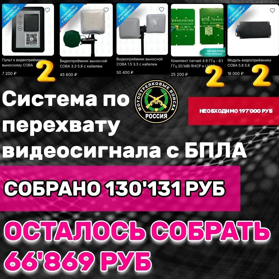 ". Напоминаем, что мы ведём сбор на систему по перехвату видеосигнала с БПЛА противника - "СОВА". Мы почти у цели. ❗️Осталось собрать 66'869 руб.❗️ Спасибо огромное всем и каждому, кто поддерживает сбор! Любую посильную сумму можно совершить по номеру карты 💳2202208188194204 или по номеру телефона 📞+79530562233 Получатель - Светлана Владимировна Л. ("Сбербанк"). *Оборудование будем заказывать у производителя после 100% предоплаты. Срок изготовления - 45 дней ‼️