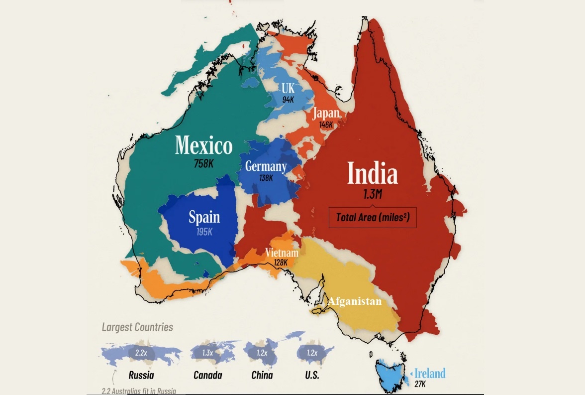 Австралия — 6 по величине страна в мире, её площадь составляет почти 7,7 миллионов квадратных километров, и она достаточно велика, чтобы вместить ещё 9 больших стран, включая Индию, занимающую 7 место в этом рейтинге. 50% территории Австралии непригодно для жизни из-за суровых пустынных условий во внутренних районах страны. Большинство из 27 миллионов жителей континента проживают вдоль побережья. Австралия занимает 54-е место по численности населения, 14-е по ВВП и 6 по площади. Только представьте, на континенте Австралия, с комфортом могли бы расположиться такие страны как: По площади она примерно равна суммарной площади 9 других стран, включая Индию, занимающую 7-е место в мире по территории и 1 место по населению. Люди часто недооценивают континентальный масштаб, рассматривая карты Меркатора, поэтому расположение стран друг над другом позволяет получить более интуитивное представление о величине. Однако при населении всего в 27 миллионов человек средняя плотность населения в Австрал