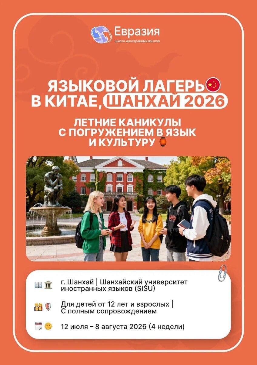🇨🇳☀️ Лето, которое прокачивает язык, даёт реальное погружение в культуру и запоминается на годы — мы запускаем сразу две программы с полным сопровождением от школы «Евразия». Шанхай 2026 Летние каникулы с погружением в китайский язык и культуру 📍 г. Шанхай, Шанхайский университет иностранных языков (SISU) 👫 для детей от 12 лет и взрослых 🗓 12 июля — 8 августа 2026 (4 недели) Харбин 2026 Летние каникулы с погружением в язык, культуру и технологии 📍 г. Харбин, Харбинский политехнический университет 👫 для детей от 12 лет и взрослых 🗓 5 июля — 26 июля 2026 (3 недели) Во всех программах: обучение, языковая практика, культурная программа и полное сопровождение на всём пути — от вылёта до возвращения. 💛 Важно: бронь всё ещё доступна со скидкой −5%. Для подробностей и брони пишите «ЛАГЕРЬ В КИТАЕ» менеджеру @Eurasia_online_help_bot