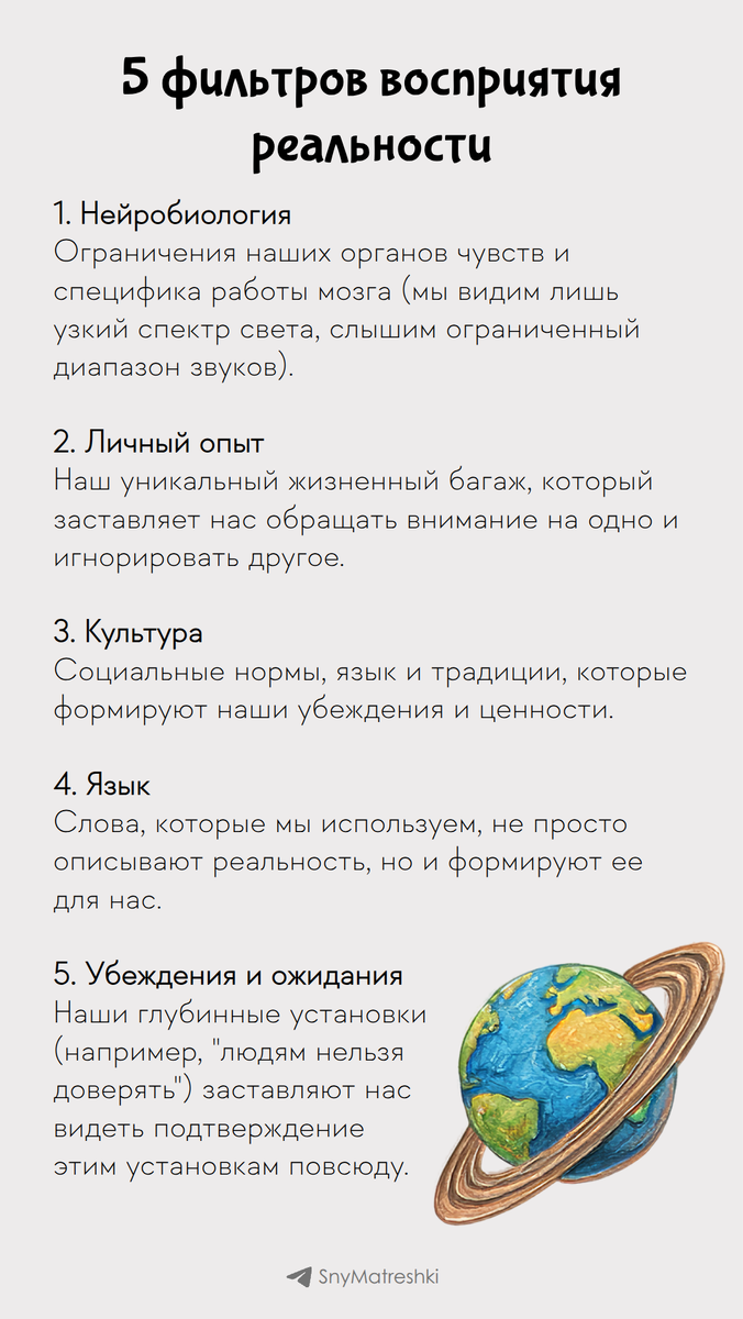 В следующий раз, когда вы будете уверены в своей правоте, спросите себя: "Какой из моих фильтров сейчас влияет на мое восприятие? Как еще можно посмотреть на эту ситуацию?". Поддержать автора Александра Бóгдан,
