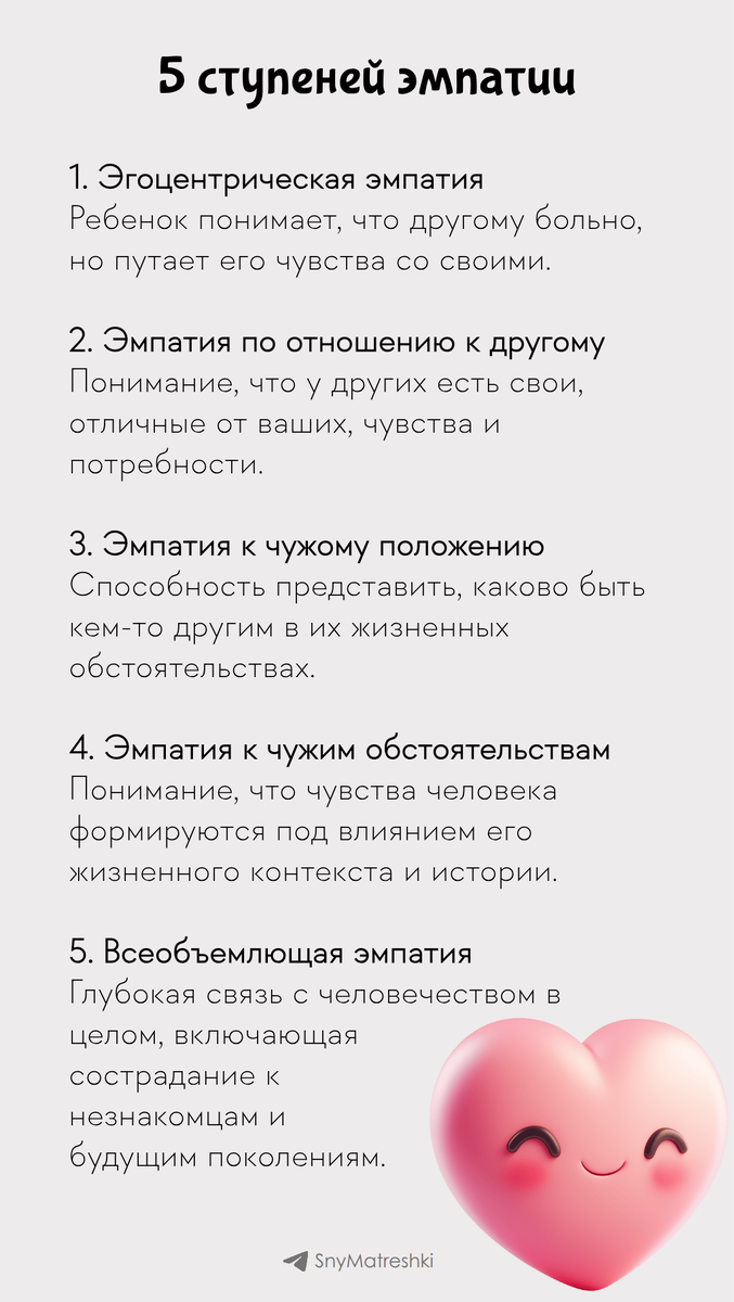 Этапы развития способности понимать и разделять чувства других, от эгоцентричных до зрелых форм. Эмпатия — это навык, который развивается и усложняется на протяжении всей жизни. Поставьте себе задачу: в течение дня попытаться понять точку зрения одного человека, с которым вы не согласны, используя 3-ю и 4-ю ступени эмпатии. Поддержать автора Александра Бóгдан,