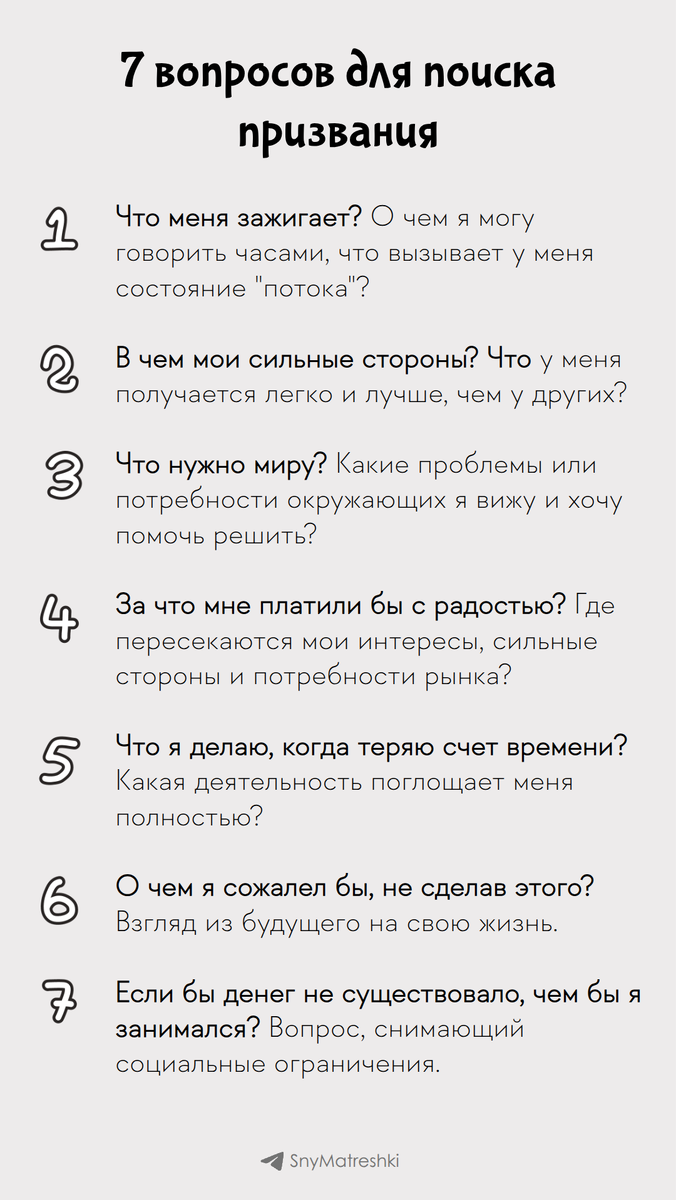 Глубинные вопросы, помогающие найти дело, которое будет наполнять энергией и смыслом. Призвание — это не точка на карте, а направление, которое находится на пересечении ваших талантов, страстей и пользы для других. Выделите час и письменно ответьте на все 7 вопросов. Ищите общие темы в ответах. Поддержать автора Александра Бóгдан,