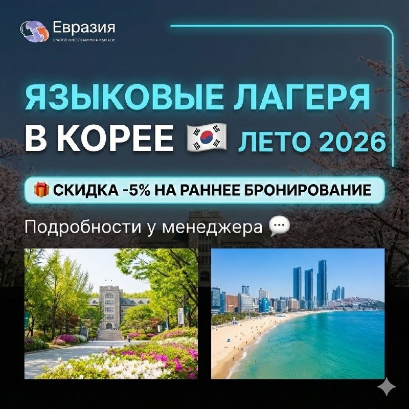 ❄️✈️ Сейчас — самое выгодное время планировать лето 2026 и бронировать языковые лагеря в Корее 🇰🇷 Пока действуют минимальные цены и скидка −5% на раннее бронирование — дальше стоимость будет расти. Что можно выбрать 👇 Пусан Лагерь на базе крупнейшей международной школы корейского языка Lexis Korean. Современная программа, сильная языковая практика, море и динамичный город. 🗓 25.07–15.08.2026 (3 недели) Сеул — университет Ewha Обучение в одном из топ-5 университетов Кореи. Академическая атмосфера, кампус в центре столицы и полное погружение в язык и студенческую жизнь. 🗓 28.06–18.07.2026 (3 недели) Сеул — Lexis Korean Международная школа корейского языка с интенсивной практикой, комфортным форматом обучения и насыщенной культурной программой. 🗓 04.07–25.07.2026 (3 недели) Во всех программах — обучение, языковая практика, культурные активности и сопровождение на всех этапах поездки. 🎁 Отличная идея для новогоднего подарка себе или близким — впечатления, которые останутс