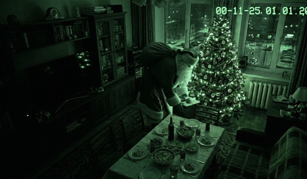Вид с камеры наблюдения. Тайплапс ведет отсчет времени по возрастающей. В кадре слева появляется русский Дед Мороз с мешком подарков в руке. Подходит к елке, ставит мешок на пол. Говорит шепотом, но басовитым, раскатистым голосом "Ох какая елочка красивая! Так, Никитке у нас тут два подарка...". Вдруг резко оборачивается, достает из кармана лазерную указку и слепит ей камеру. Изображение начинает.