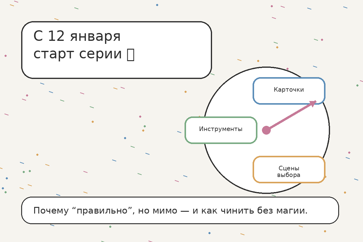 С 12 января начинаем серию, где будем собирать всё это в практику — короткими, понятными шагами. Что будет в серии: Формат простой: читается как эссе, заканчивается чек-листом — чтобы можно было сохранить и применить. Если тебе знакомо ощущение “я всё сделал правильно, но не работает” — ты по адресу.