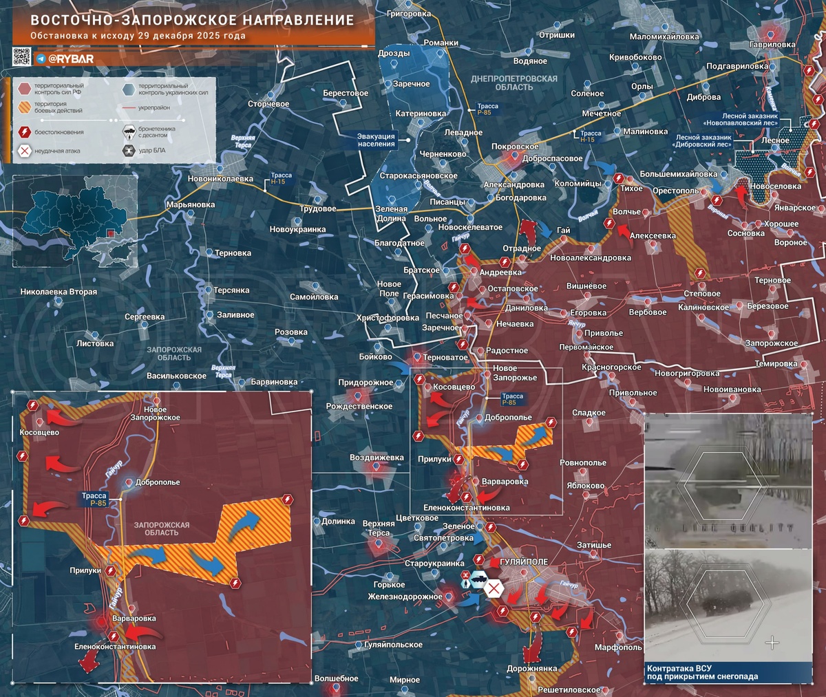 Растет активность украинских формирований и на Восточно-Запорожском направлении, где ВСУ недавно окончательно утратили Гуляйполе. Противник «опомнился» и теперь пытается не допустить закрепления ВС РФ на новых рубежах. 🔸Под прикрытием непогоды бронегруппа противника переправилась через Гайчур в районе села Прилуки. Затем ВСУ попытались прорваться в сторону Равнополья и Сладкого, разделившись спустя несколько километров после пересечения русла реки. Но вражескую пехоту и технику сожгли операторы БЛА. 📌 В районе Гуляйполя российские подразделения закрепляются на достигнутых рубежах, а также ведут зачистку пояса обороны вокруг города. В ближайшее время им предстоит занять карман южнее, а также прилегающие опорные пункты. 🔸Кроме того, украинские формирования провели этим утром контратаку со стороны Железнодорожного, однако и там успеха не добились, потеряв порядка двух отделений личного состава и ББМ. 🔸Если у Вас есть дополнения по обстановке, Вы хотите, чтобы мы подсветили успехи Ваше