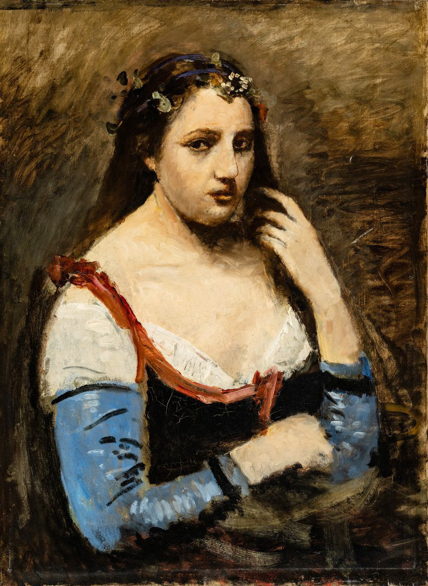 Хотя французский художник Камиль Коро (1796–1875) известен прежде всего своими гармоничными и изящными пейзажами, в последние два десятилетия своей жизни он также написал множество фигуративных работ. Часто он изображал своих моделей в итальянской или восточной одежде в натуральную величину. Эти картины представляют собой определенный переход между портретами, исследующими индивидуальные черты модели, её личность и душевное состояние, и идеализированными зарисовками. Модели чаще всего были представлены в естественной или студийной обстановке, но коричневатый, темный фон рассматриваемой картины, названной в честь цветов, украшающих волосы женщины, остается неопределенным. Движение руки женщины, поправляющей волосы, и её вопросительный взгляд, когда она поворачивается к зрителю, создают ощущение запечатленного момента. Незаконченная, похожая на эскиз картина дает представление о методе работы художника: Коро сначала набросал темный фон, а затем проработал более светлые тона. Рентген