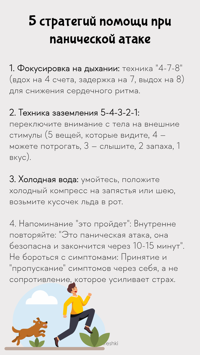 Практические техники "скорой помощи" для смягчения симптомов и возвращения в реальность. Борьба с паникой усиливает ее. Ключ — в смещении фокуса внимания и принятии. Составьте для себя "памятку" с 2-3 самыми действенными для вас стратегиями и носите ее в телефоне. Поддержать автора Александра Бóгдан,