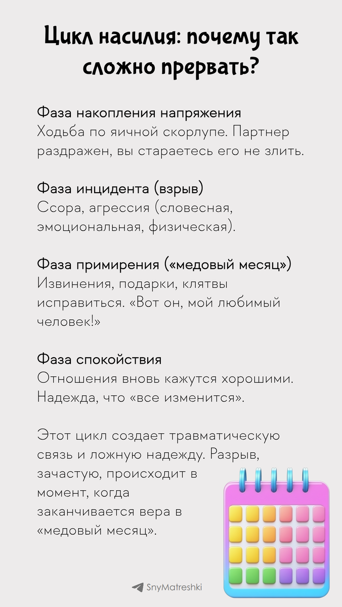 Этот цикл создает травматическую связь и ложную надежду. Разрыв, как правило, происходит, когда заканчивается вера в «медовый месяц». Поддержать автора Александра Бóгдан,