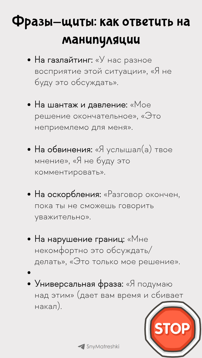 Вам не нужно каждый раз придумывать ответ. Заранее приготовленные «щиты» помогут сохранить самоуважение и не растратить энергию. Выучите 2-3 свои любимые. Поддержать автора Александра Бóгдан,