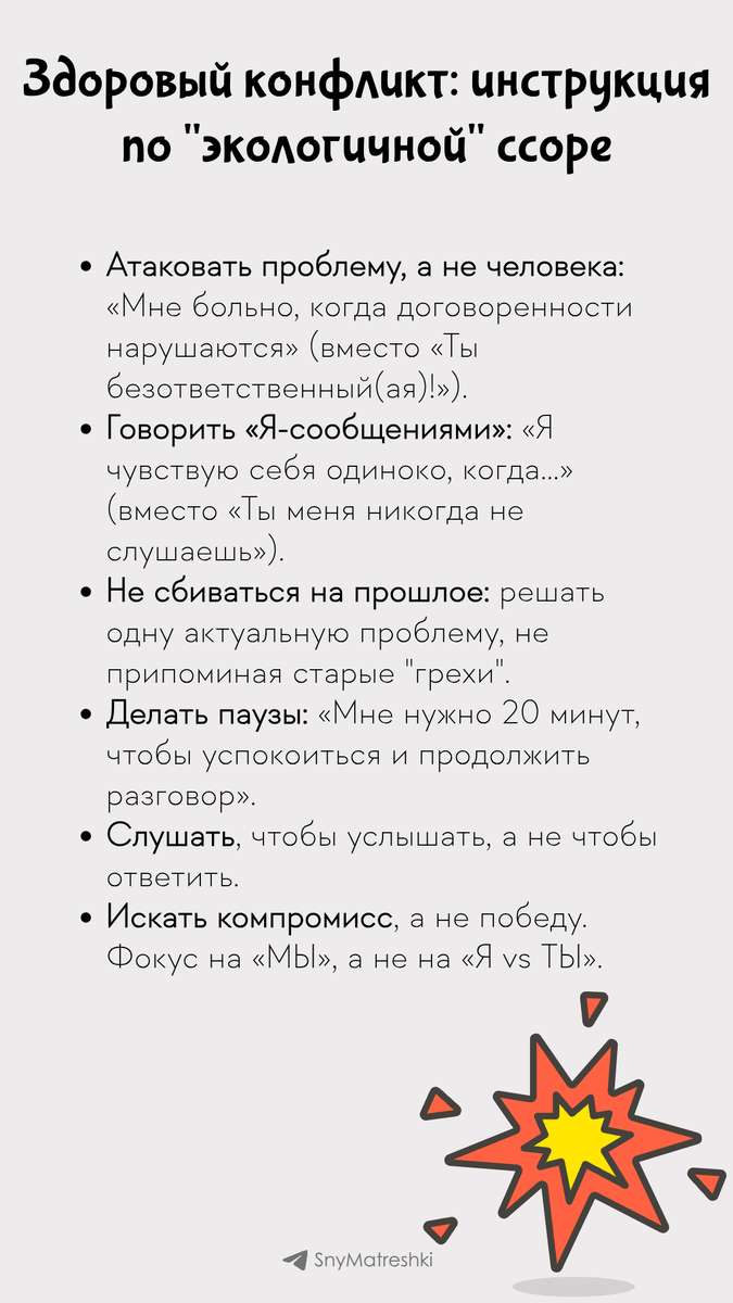 В здоровых отношениях тоже ссорятся. Но ссора — это не война, а совместный поиск решения. Сохраните эту памятку для своих будущих «экологичных» разногласий. Поддержать автора Александра Бóгдан,