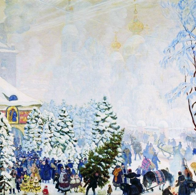 ". Она наполнена счастьем, позитивом, предновогодним настроением. Это, конечно, идеализированная картинка елочного базара перед Рождеством. Все люди очень красиво одеты, женщины все в мехах. Радостное настроение. Народ как будто бы не выбирает елки, а ждет чуда. А над всем этим торгом сияют в далекой высоте купола наших церквей. Скоро Рождество!