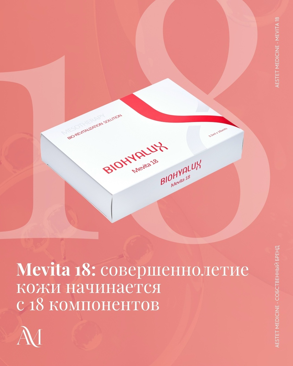 В 18 лет начинается взрослая жизнь и самостоятельность. Аналогично Mevita 18 предлагает взрослый и ответственный подход к уходу за молодой кожей пациенток в возрасте 20-30 лет, где профилактика ранних изменений важнее коррекции. Mevita 18 — это инновационный мезоревитализант, разработанный для компенсации метаболических нарушений и восстановления ресурсов кожи в условиях современного хронического стресса (недосып, неправильное питание, гаджеты). Ключевые компоненты Mevita 18: • Гиалуроновая кислота (ГК) 15 мг/мл (4 фракции): Восстанавливает естественный гидробаланс кожи, который начинает нарушаться уже с 25 лет.