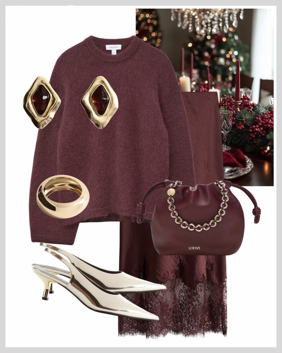Этот образ — про роскошь без усилий: мягкий вишнёвый джемпер даёт уют и глубину, юбка с кружевом добавляет праздничности, золотые украшения создают свет у лица, сумка поддерживает цветовую историю, а светлые зеркальные туфли делают финальный яркий штрих. В итоге получается комплект, в котором можно встречать гостей, идти на ужин, в театр или на красивое зимнее мероприятие — и везде выглядеть уместно, женственно и очень дорого.