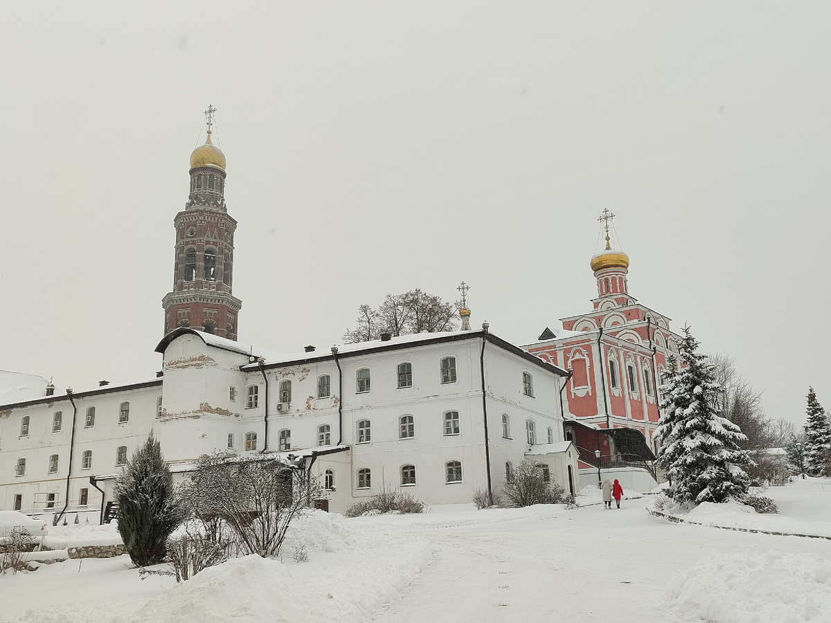 Мне не так уж часто встречаются монастыри с двумя колокольнями. Под малой шатровой трёхъярусной колокольней XVII века расположен храм, освященный в честь Тихвинской иконы Божией Матери, святителя Николая чудотворца и благоверного царя-страстотерпца Николая. Именно колокола с малой колокольни своим звоном созывают братию на ежедневную Божественную литургию. Летом можно подняться наверх по крутой винтовой лестнице, чтобы полюбоваться на Оку и живописные окрестности.