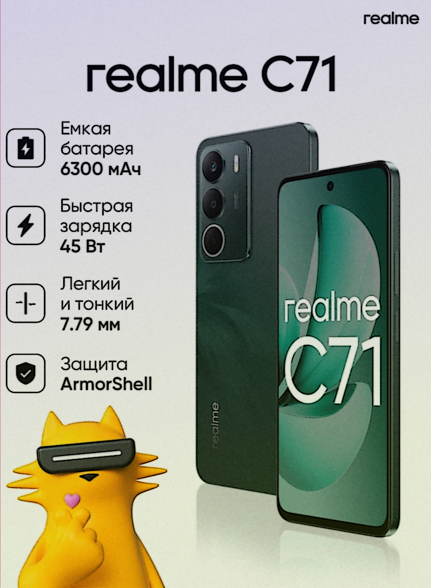 В модельном ряду realme серия C всегда отвечала за рациональный подход и разумную экономию. Realme C71 — это свежая новинка в бюджетной линейке, которая предлагает сбалансированное сочетание характеристик для повседневного использования. Несмотря на доступную цену, производитель не пошел на компромиссы в ключевых аспектах, важных для пользователя.