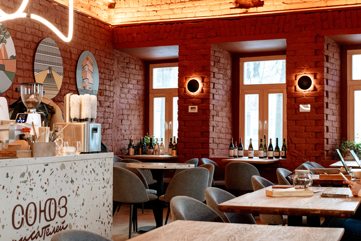 После долгой реконструкции здание сохранило свою подлинность. Старые балки XVIII века, намеренно оставленные следы разрушенных стен — новое здесь не перекрывает прошлое, а аккуратно в него встроено. Интерьер держится на теплых винных оттенках, разбавленных светлыми пятнами, будто паузами между строками. На цокольном этаже — камерное пространство на 20 человек с отличной акустикой и виниловым проигрывателем.