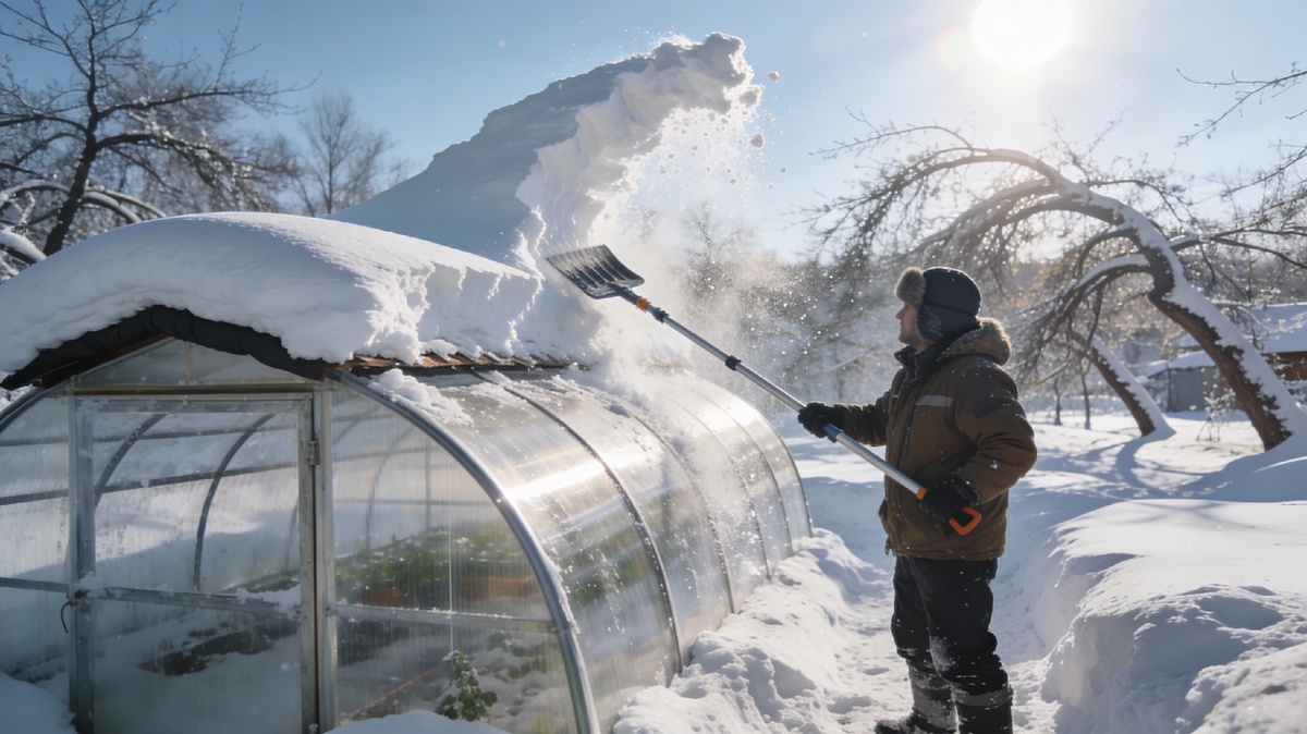 Подхожу к участку. Красота! Сугробы блестят. Смотрю на теплицу из поликарбоната... а у неё крыша прогнулась, как спина у кота. Снег мокрый, тяжелый. Если сейчас не скинуть — весной буду покупать новую.