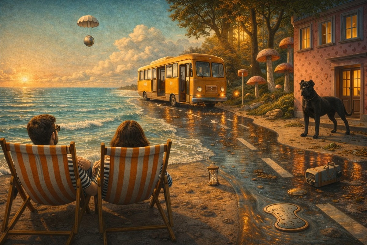 Половина седьмого утра, мы с мужем в тельняшках на фоне бирюзового моря. Под звуки 70-х в золотистой оправе шанель вижу летящий с крошечным парашютом металлический шар. Я знала, что он наш, хотя не могла объяснить — зачем. Прямо из космоса. Шар, наполненный криптовалютой, спускается на другом конце планеты на пляж в моей родной стране. Бросаю Лонг-Айленд и прямо из шезлонга запрыгиваю в автобус цвета охры с конечной "утонувшая ценность", где шар должен был упасть. В окна я вижу мягкий мох, свет сквозь кроны, каждая остановка автобуса - как кадр живописного артхауса, что само по себе напоминает сон за рулём, где каждый листик кажется опекуном чужой тайны, а грибы перекидывают капли росы словно играют в бирпонг. Влажный асфальт скатывает автобус как серф и, кажется, приближает меня к точке назначения. Нет. Двери открываются симметрично, и я уже в ресторане с розовыми стенами в горошек под французский шансон сжимаю ложку в руках, вытирая капли эспрессо с губ под звуки слияния атомов, шерш