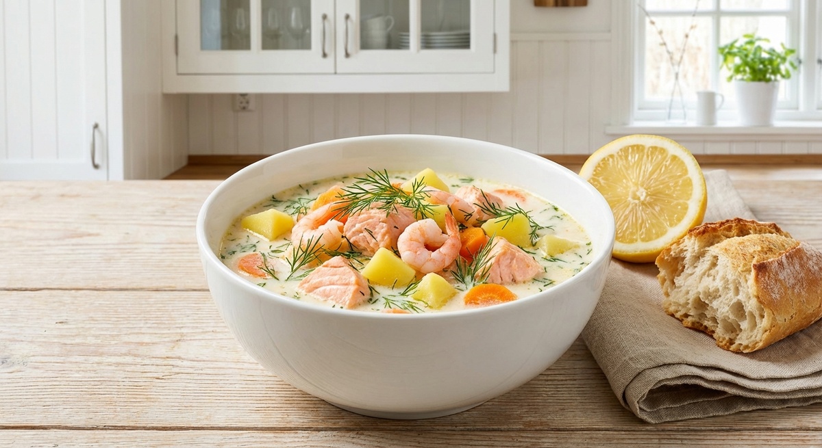 А вот горячее первое часто забывают. Максимум — миска бульона «для тех, кто переел». Сливочный суп с лососем и креветками: Ниже — понятный пошаговый рецепт, который можно подать: На этом этапе у нас классическая база, которая даст супу объём и «домашний» вкус. Важно: нам не нужен жареный до тёмно-коричневого цвет, задача — сделать овощи мягкими и ароматными. Если используешь белое вино: Параллельно с варкой овощей: Важно: рыбу и креветки не нужно мариновать, они очень быстро принимают вкус бульона. Когда картофель почти готов: Вари суп ещё 4–5 минут на небольшом огне: Слишком долго держать рыбу в супе не нужно, иначе она развалится и пересушится. По желанию — щепотка копчёной паприки для лёгкого «дымного» аромата. Дай супу постоять 5–7 минут под крышкой — он станет более собранным по вкусу. Для подачи: Для новогоднего стола можно поставить супники/креманки поменьше — чтобы это было лёгкое горячее перед основным мясным блюдом.