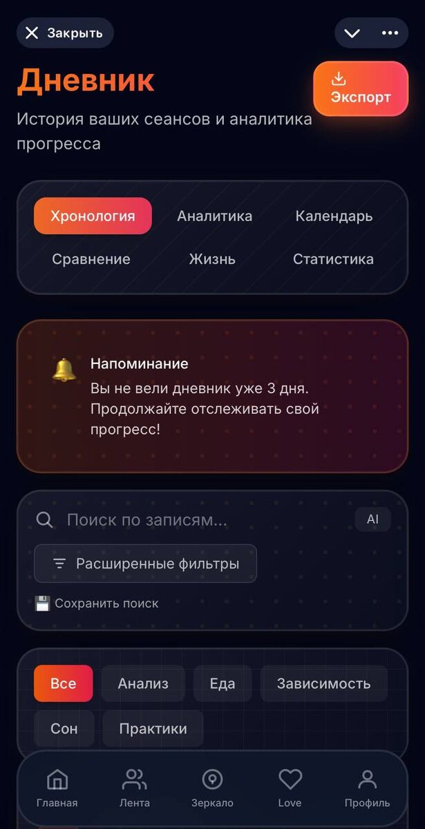 Дневник паттернов в Mirror: как появляется статистика и "карта повторов" Вы делаете анализ в Mirror. Сохраняете в дневник. Через неделю открываете - и видите статистику. Не "кажется, я всегда тревожный". А конкретные данные: - "За неделю вы сделали 7 анализов" - "Самый частый паттерн - перфекционизм (35% случаев)" - "Чаще всего тревога появляется вечером (после 20:00)" - "После качественного сна паттернов на 20% меньше" Это не просто "интересно". Это инструмент для изменения. Как это работает: 1) Вы накапливаете данные Каждый анализ, каждая практика, каждый сон, каждая еда - всё сохраняется в дневник. 2) Mirror анализирует паттерны Находит повторяющиеся сценарии: "вы тревожитесь чаще всего по понедельникам" или "вы едите нездоровую еду после конфликтов". 3) Вы видите "карту повторов" Не хаос, а структура. Вот ваши триггеры, вот ваши паттерны, вот ваши циклы. 4) Вы получаете конкретные действия "Ваш триггер - понедельник утром. Вот план подготовки к понедельнику" или "Ваш паттерн - перф