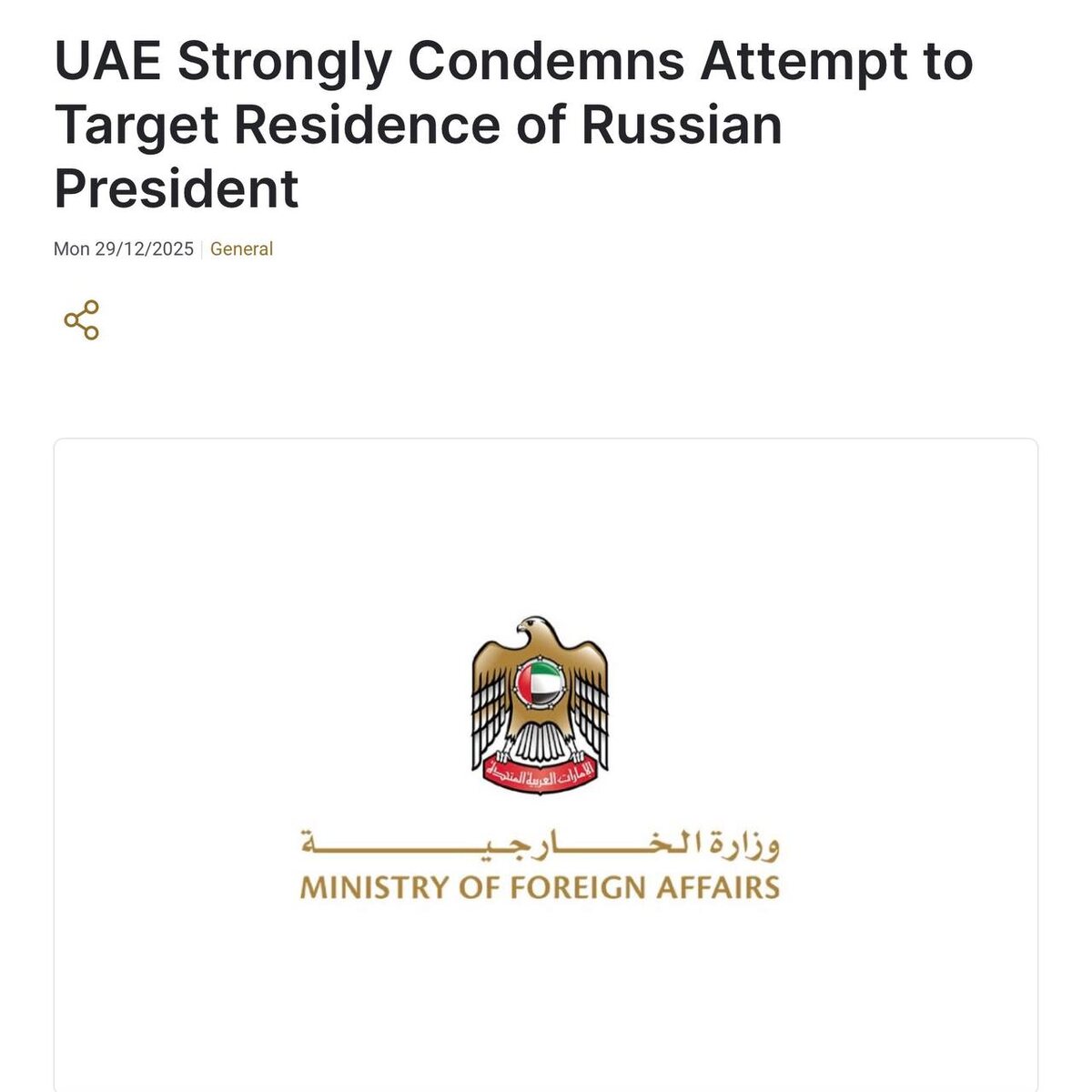 🇦🇪 ОАЭ осудили попытку нападения на госрезиденцию Путина, заявляет МИД страны