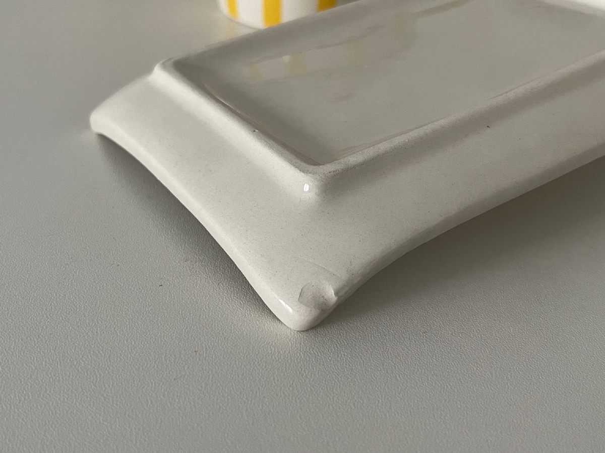 Коллекция цирк представлена в трех цветах: красном, желтом и сиреневом. Но что самое популярное - это масленка с крышкой в виде шатра. Особенно красная. Красных конечно же нет ни в одном Фикс Прайсе, прошаренные люди раскупили их давно, кто-то даже скупал коробками. Я взяла одну желтую и одну сиреневую. Там были еще, но взяла на пробу по одной, и хорошо, что не больше. Их обе у меня купили. Но не сразу, недели две они повисели. С ними было сильное разочарование. Когда я их стала фотографировать, оказалось, что эта посуда низкого качества, а масленки особенно. Если бы это была посуда СССР, стояло бы клеймо 3 сорт (или даже 4, если такой есть). У одной на нижней стороне оказался скол, у другой три огромные соринки и в таком виде их покрыли лаком, то есть это брак на производстве.