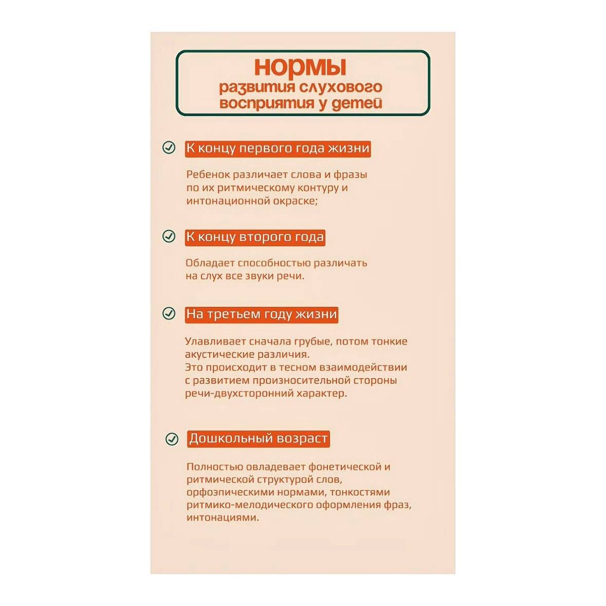 Существуют возрастные нормы развития слухового восприятия. Они помогают родителям и педагогам ориентироваться, когда ребёнку нужна дополнительная поддержка. Например: