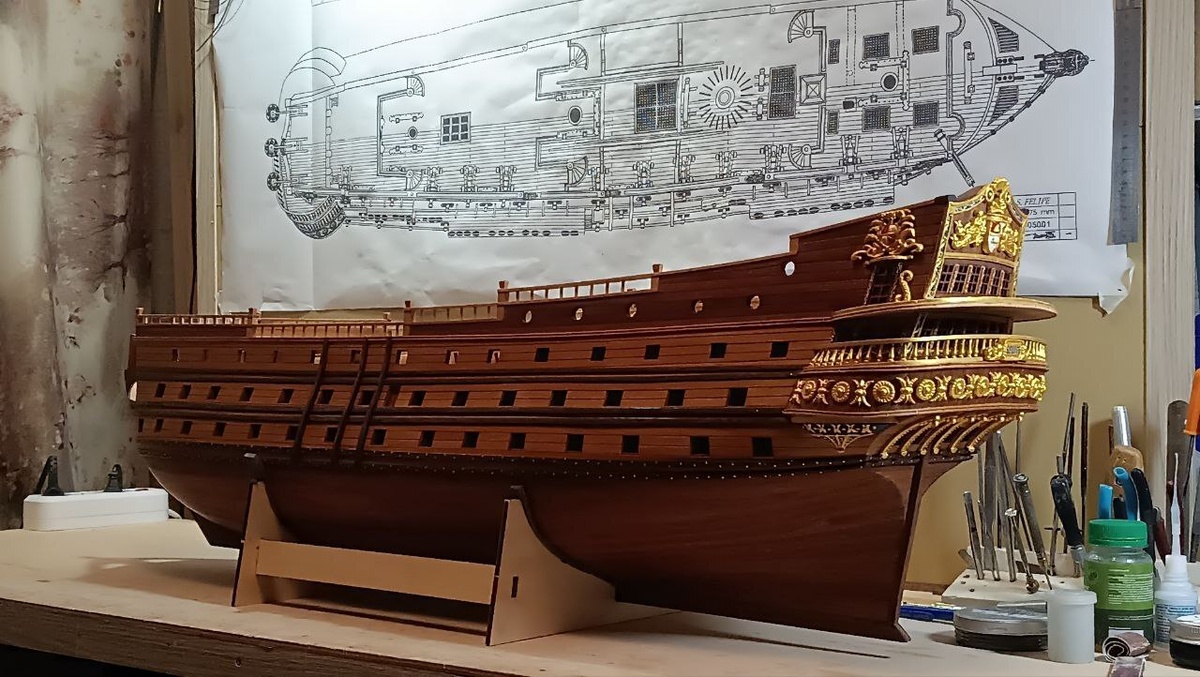Всех моих подписчиков, да и просто заглянувших в пост Пикабушников с Наступающим Новым 2026. А я продолжу обзор постройки испанского мановара. В предыдущей серии доделал ограждение планширя и как бы уже пора корпус парусника в божеский вид привести. Пока масло на корпусе ниже ватерлинии впитывалось в общивку, занялся наконец кормой. Теперь можно и весь корпус маслом покрыть. Когда все наконец высохло прошелся по корпусу стальной ватой нулевкой. Шкуркой практически бесполезно, ее сразу забивает на масляных поверхностях. Теперь можно и красоту на корме наводить. Но в первую очередь конечно надо сделать ограждение галерей. И вот тут я только на нижней галерее на неделю завис. А до верхней галереи не успел добраться до Нового года. Пожалуй самое сложное место во всей этой канители. Матерился много, особо когда пальцы суперклеем прихватывало, вроде и пинцетом стараешься работать, но местами пинцетом не с руки, пару раз пришлось скальпелем подушечки пальцев друг от друга отделять. Пока то да