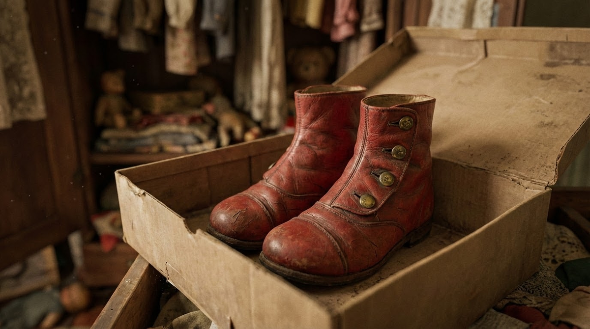 Маленькие красные ботиночки с круглыми носами и латунными кнопками. Кожа потрескалась от времени, левый шнурок истрепался и почти развалился, но в целом они сохранились хорошо. Даже подошва была почти не стёрта – будто в них едва ходили.