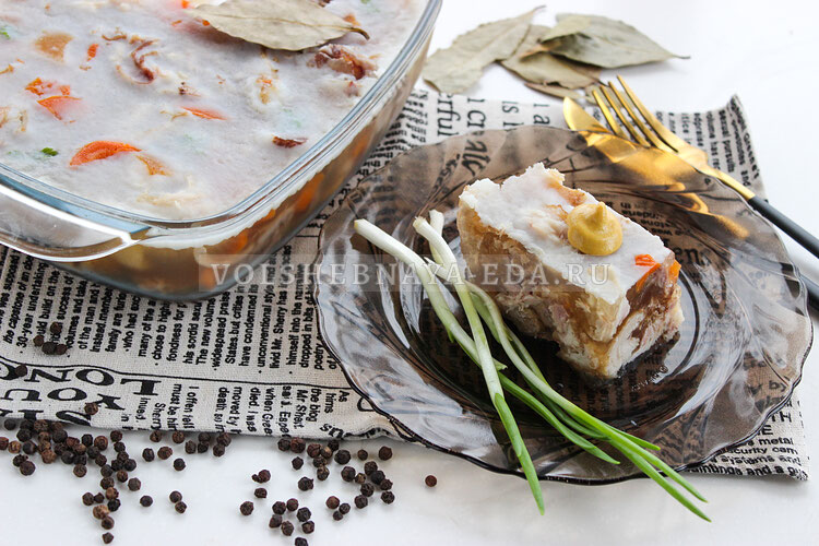 Готовим вкусный домашний холодец из рульки (свиной голяшки и ножки), без желатина. Чтобы холодец хорошо застыл, его нужно долго варить — не меньше 4-5 часов на тихом огне. За это время вы получите много природного желатина, который содержится в хрящах и суставах, благодаря чему бульон застынет, будет резаться ножом. Совет! Попросите своего мясника разрубить голяшку пополам (на 2 части), так вам будет легче уместить ее в кастрюлю. Общее время: 10 часов | Время приготовления: 5 часов