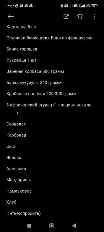 Смотрите сразу фото. Нет, сначала так. Сначала мне от дочери прилетает вопрос: – Сколько продуктов надо покупать на оливье на пять человек? А на салат с крабовыми палками? В результате список покупок был примерно таким. А потом они начали готовиться. Под возмущенные вопли дочери в мою сторону: – Какой пакетик риса на пять человек, это ж буквально одна порция, мы еще варим! Это фото подоготовки. Это непосредственно праздничный стол. И это... Да, салаты в кастрюлях. Ну, нет у них салатников. Да, на столе картошка. Но! Это вареная картошка. Это почищенная предварительно картошка. Это порезанная картошка. Какие могут быть претензии? )))) Да, что-то на столе в упаковках, что-то в баночках. Ох, помню я, как кто-то в комментариях уж так негодовал по поводу сметаны в баночке на столе. )) Ибо в лучших домах Парижу и ЛондОну так не положено. Так они ж не в них. ) Они ж общаге. И даже глинтвейн сварили. Опять же. Тряпочка в кастрюле – это не кусок футболки. Это тряпочка для протирки мебели. В смы