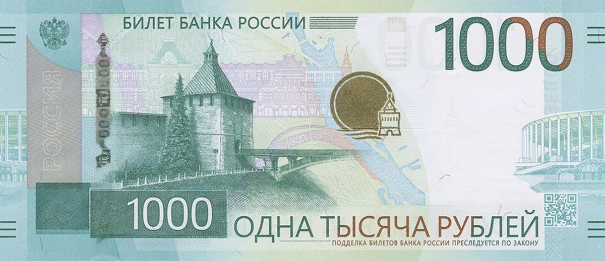 Банк России 26 декабря 2025 года вводит в обращение обновленную банкноту номиналом 1000 рублей. Банкнота посвящена Нижнему Новгороду и Приволжскому федеральному округу. Основное изображение лицевой стороны – Никольская башня Нижегородского Кремля, на оборотной стороне изображены Саратовский автомобильный мост, судно на подводных крыльях «Метеор-120Р», Дворец земледельцев в Казани. Также присутствует изображение «Совкомбанк Арены» – стадиона «Пари НН», расположенного в Нижнем Новгороде.
