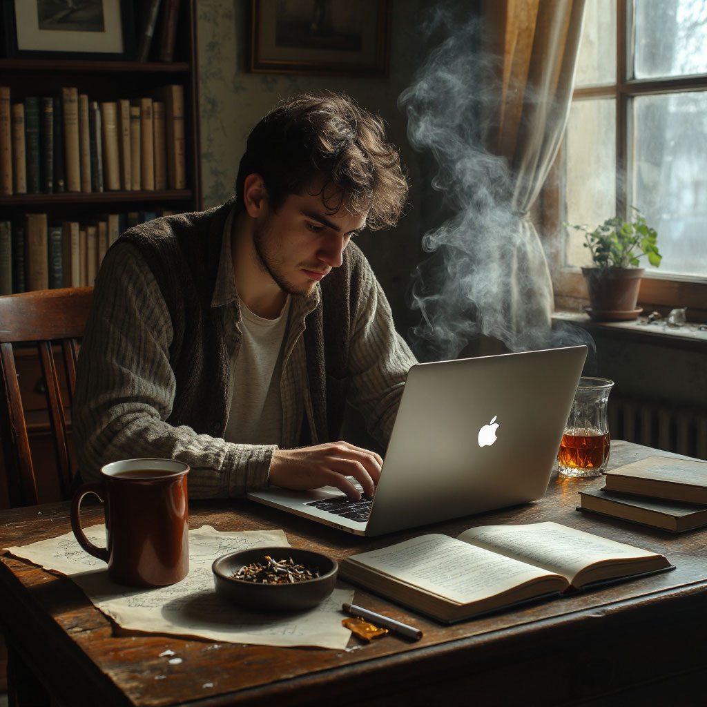 Вася, сгорбившись, сидел за письменным столом. На столе стоял старенький ноутбук, слева от которого дымилась кружка с чаем. Справа страдала и воняла полная пепельница. Василий тосковал.