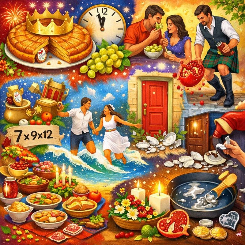 Во Франции в новогоднюю ночь или накануне пекут особый пирог — galette des rois. Внутрь прячут боб или маленькую фигурку. Тот, кому попадётся сюрприз, становится «королём» или «королевой» вечера и может загадывать желания или раздавать шуточные приказы. Считается, что удача будет сопровождать его весь год. Испанцы встречают Новый год с тарелкой винограда. Под каждый из 12 ударов часов нужно съесть по одной виноградине. Если успеешь — год будет удачным. Каждая виноградина символизирует один месяц грядущего года. Традиция настолько популярна, что виноград продают заранее уже очищенным и расфасованным по 12 штук. В Греции в новогоднюю ночь хозяин дома разбивает гранат о порог. Чем больше зёрен рассыплется, тем больше счастья, богатства и благополучия принесёт Новый год. Гранат здесь символ изобилия, плодородия и семейного счастья. В Шотландии существует традиция First Footing. Считается, что первый человек, переступивший порог дома после полуночи, определяет, каким будет весь год. Лучший