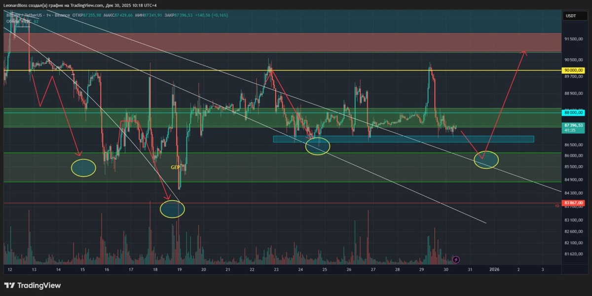#мнениепорынку 🕯🕯🕯 ⚠️Итак, коллеги, логичное продолжение озвученное мной вчера свершилось, сценарий отработал = зона уровня 86К удостоена внимания! При этом, учитывая оставшийся свободный зазор чуть ниже текущей цены, чтобы уж в полной мере протестировать границу канала, для меня не хватает короткого сквиза к нижнему блоку, где также состоится его очередной тест!! ⚠️На первом графике вы можете видеть локальный промежуточный блок поддержки (голубой цвет), который сформирован лоями последних 7 дней раскачивания качель. Вот именно под него просится удар для сбора ликвидности + еще одна доп пугалка для альтов, чтобы все окончательно ушли на праздники без позиций. Итак, зона над уровнем 85К сегодня для меня ключевая, после ретеста которой можно брать маржинальные позы!! P.s. в среднесроке, вот этого самого снижения в зону 86К абсолютно достаточно, для того, чтобы с текущих выпрыгнуть снова на уровень 88К и отправиться выше. Я сейчас озвучиваю локальную картину и пока цена ниже 88К =