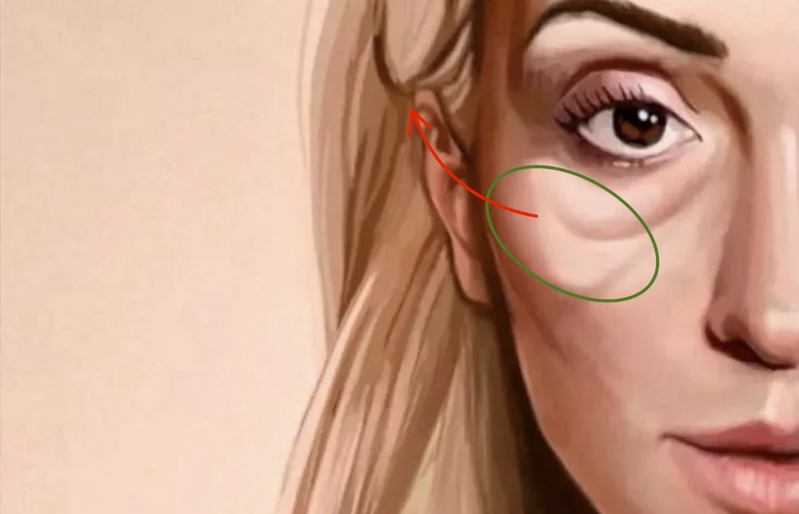 - Первое: делаем массаж височных мышц. Мы помним, что суфы это часто отёки в жировых пакетах, но блок лимфы и жидкости может быть затруднен напряжением жевательных мышц. Для массажа кладем подушечки пальцев рук в область висков и массируем круговыми движениями около 30-60 секунд.