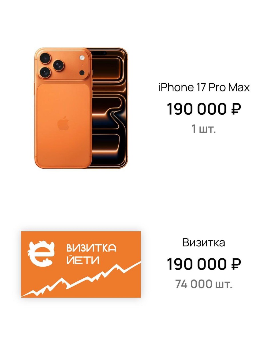 Российские маркетологи и бренды подхватили стихийный тренд, который остроумно обыгрывает стоимость нового iPhone. Вместо прямых сравнений они наглядно демонстрируют, какой объём продукции можно получить за те же деньги. Кто-то предлагает 1681 эчпочмак, кто-то — 2264 литра «Жигулёвского», превращая абстрактную цену гаджета в понятные и зачастую внушительные количества знакомых товаров. Йети предлагает вам 76 000 штук визиток, чтобы обзнакомиться и обнетворчиться в 2026 году 🙋☺️ Для заказа пишите нам в @yeti_print 😁