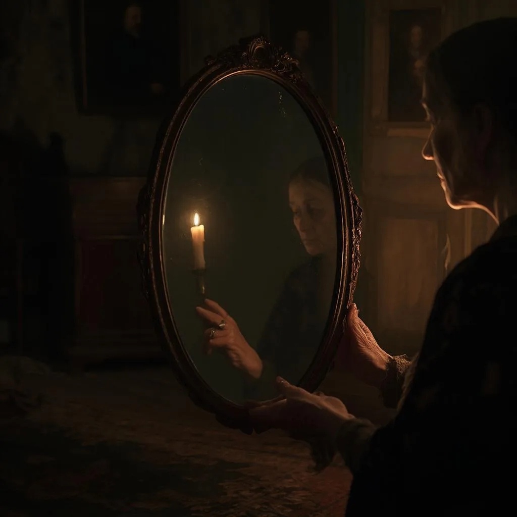 Руки в полутьме держат старинное зеркало в серебряной оправе. В его поверхности отражается не лицо, а светящееся золотое сердце, и в этом отражении видна вторая пара рук, бережно касающихся оправы с другой стороны.