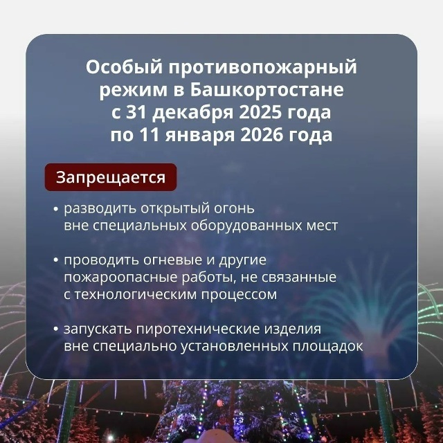 Об этом сообщил Радий Хабиров. - С завтрашнего дня и на все новогодние каникулы вводим в республике особый противопожарный режим. Разводить огонь, запускать фейерверки можно только в специально оборудованных для этого местах. Как и всегда, все наши экстренные службы будут на посту. Но прошу вас работы им не добавлять и соблюдать элементарные правила безопасности. Берегите себя и своих близких! И пусть праздники пройдут спокойно, - отметил руководитель региона.