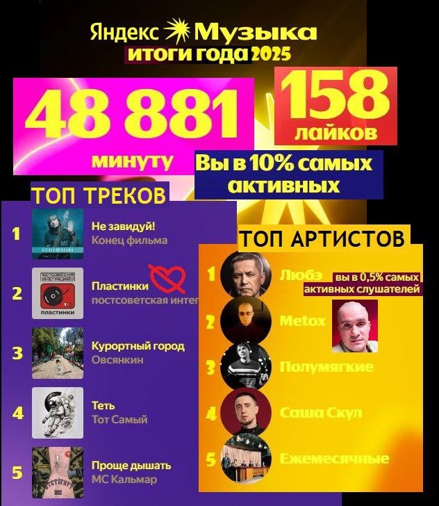 • 49к минут / в 10% самых активных слушателей • 158 лайков (я был скуп) • Топ 3 жанра: поп-рок, андеграундный хип-хоп, альтернативных поп-рок (жанры это атавизм, забейте) • Любимый артист: ЛЮБЭ (1691 минута) Очень удивился, как я попал в 0,5% слушателей ЛЮБЭ; а потом понял: это из-за геогессера; нет более подходящего саундтрека для панорамных путешествий по России, чем приглушённое ЛЮБЭ на фоне, да и по Питеру теплее с тулупчиком заячьим • Топ-трек: Не завидуй, Конец фильма (не завидуйте) Про трек «Пластики»: на нём нет моего лайка. А это топ-2 трек. Чтож, так бывает: в топ иногда попадает то, что просто существует, иногда включается и не раздражает, а лайка не заслуживает В моём плейлисте года из 50 треков 12 без лайка. Тем занимательнее подумать, что такое топы на самом деле. Ссыль: https://music.yandex.ru/playlists/ps.68e36eab-2890-4945-b1ed-2ea87c682a57 Metox (1402 минуты) — моё главное музоткрытие года и реальный топ-1. Ибо я слушал его не только в я.ме, где треки порезали. Д