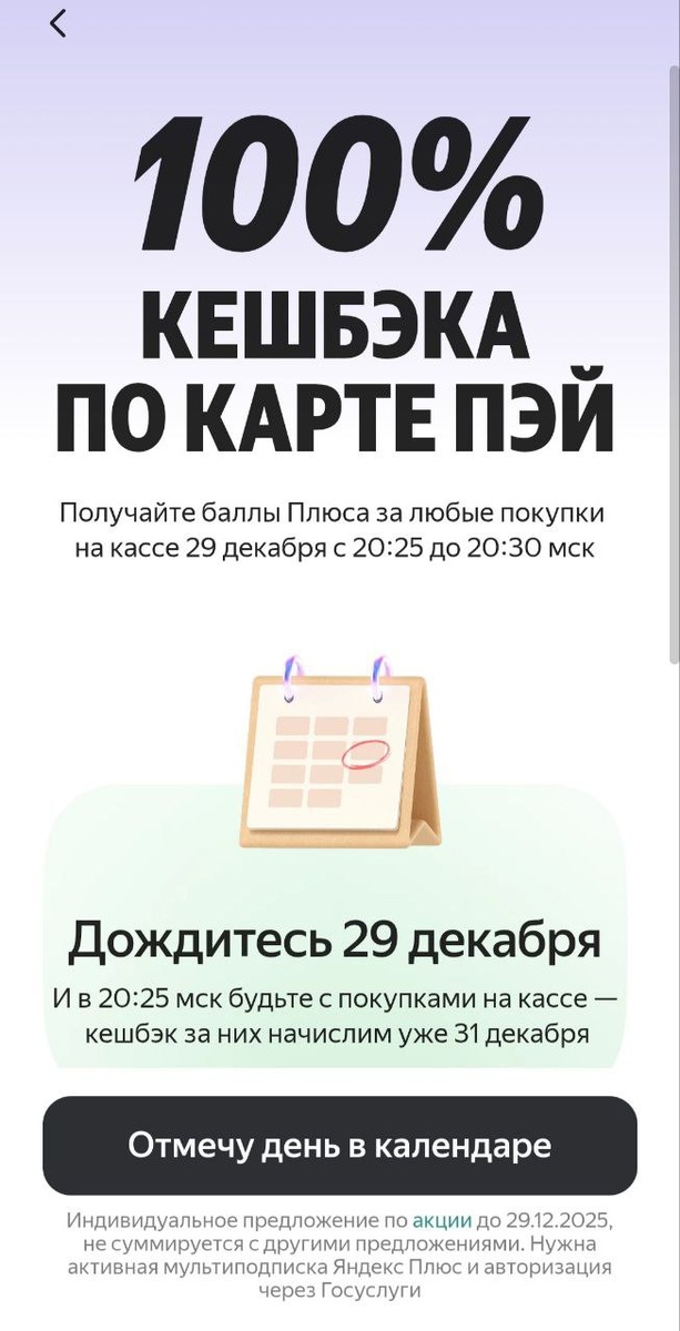 —————————————————— Вчера у Яндекса была акция со 100% кешбеком на оффлайн покупки с возможностью возврата 10 000 баллов. Время на покупку всего 5 минут. С 20:25 до 20:30. Решил тоже поучаствовать, но время по часовому поясу отличалось, а магазины электроники не работали. Выбрал ближайшую "Ленту". В начале подумал, что большой наплыв людей связан с новогодними праздниками. Отчасти это так, но ближе к времени выяснилось, почти все пришли получать кешбек. Такого пика еще не видел и мягко удивился, насколько многие "прошаренные", с несколькими телефонами и десятками тысяч рублей на балансе. Выгоднее всего скорее всего купить товар, цена которого превышает несколько тысяч рублей, чтобы не тратить много времени на кассе и выбирать небольшие магазины. Хотя это тоже не гарантировало результат, ведь сам сервис перестал работать. Ожидаемо терминалы не принимали оплату и лишь единицам удалось пробить несколько товаров. —————————————————— В итоге ушел домой без покупок, но с огромными вп