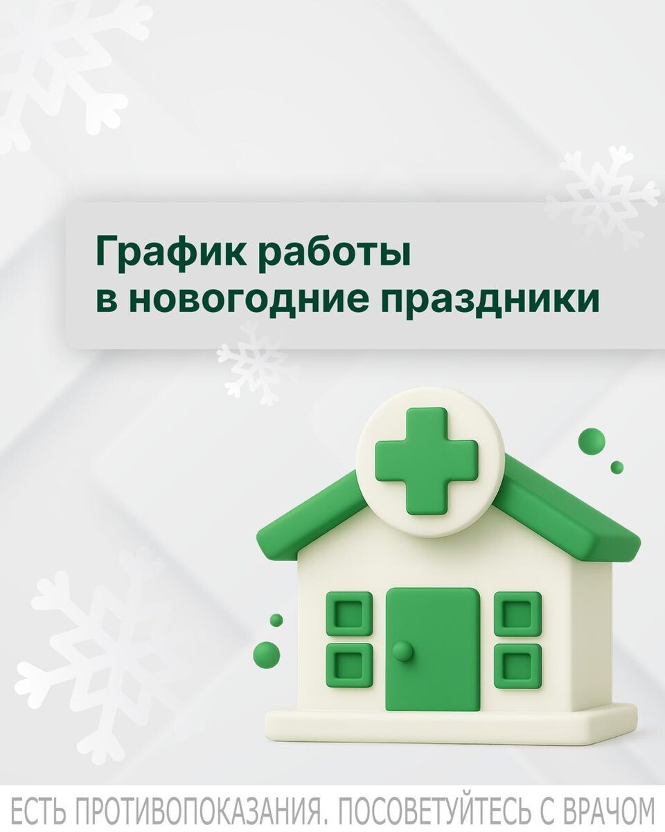 ! Обращаем внимание, что центры будут работать в другом режиме. 31.12, 01.01 и 07.01 во всех центрах выходной день! 🟢ДЦ на Свердлова 🟢ДЦ на Монтажников 🟢ДЦ на Менделеева 🟢ДЦ на Ямской 🟢ДЦ на Протозанова 🟢МЦ на Боровской 🟢МЦ на Холодильной 🟢МЦ на 50 лет Октября 🟢МЦ Перевалово 🟢ДЦ Северный 2 января — выходной день 3, 4, 5, 6, 8, 9. 10, 11 января — с 8:00-15:00 🟢ДЦ на Газовиков 🟢МЦ на Республике 🟢ДЦ на Гольцова 🟢МЦ на Чаркова 🟢МЦ на Джанбровского 2, 4, 5 6, 8, 9. 10, 11 января — с 8:00-15:00 3 января — выходной день 🟢МЦ на Московском тракте 2 и 3 января — выходной день 4, 5, 6, 8, 9. 10, 11 января — с 8:00-15:00 🟢МЦ Опера 2-11 января — с 8:00-15:00 🟢Тобольск 2 января — выходной день 3, 4, 5, 6, 10, 11 января — с 8:00-15:00 8 и 9 января — с 7:30-19:00 🔰Взятие биоматериалов до 13:00 во всех центрах! ✅ Планируйте свой визит заблаговременно. 📎Контакт-центр работает в праздничные дни с 8:00 до 15.00. Имеются противопоказания. Требуется консультация специалиста. #в